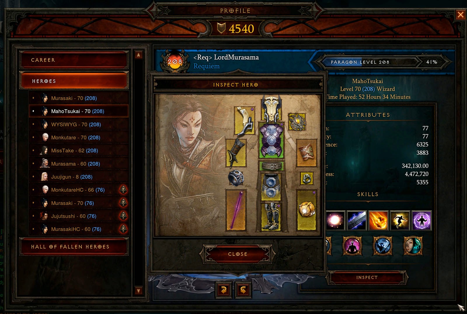 Both characters have around 6 hours of actual game time on them at level 70. As mentioned in my previous post, it took around 28 hours of game play at level cap during PTR/beta, to get the majority of slots filled with legendary/set items (this was the amount of time I also had on MahoTsukai during the pre-expansion where I had 4 pieces of the Tal Rasha set equipped).
