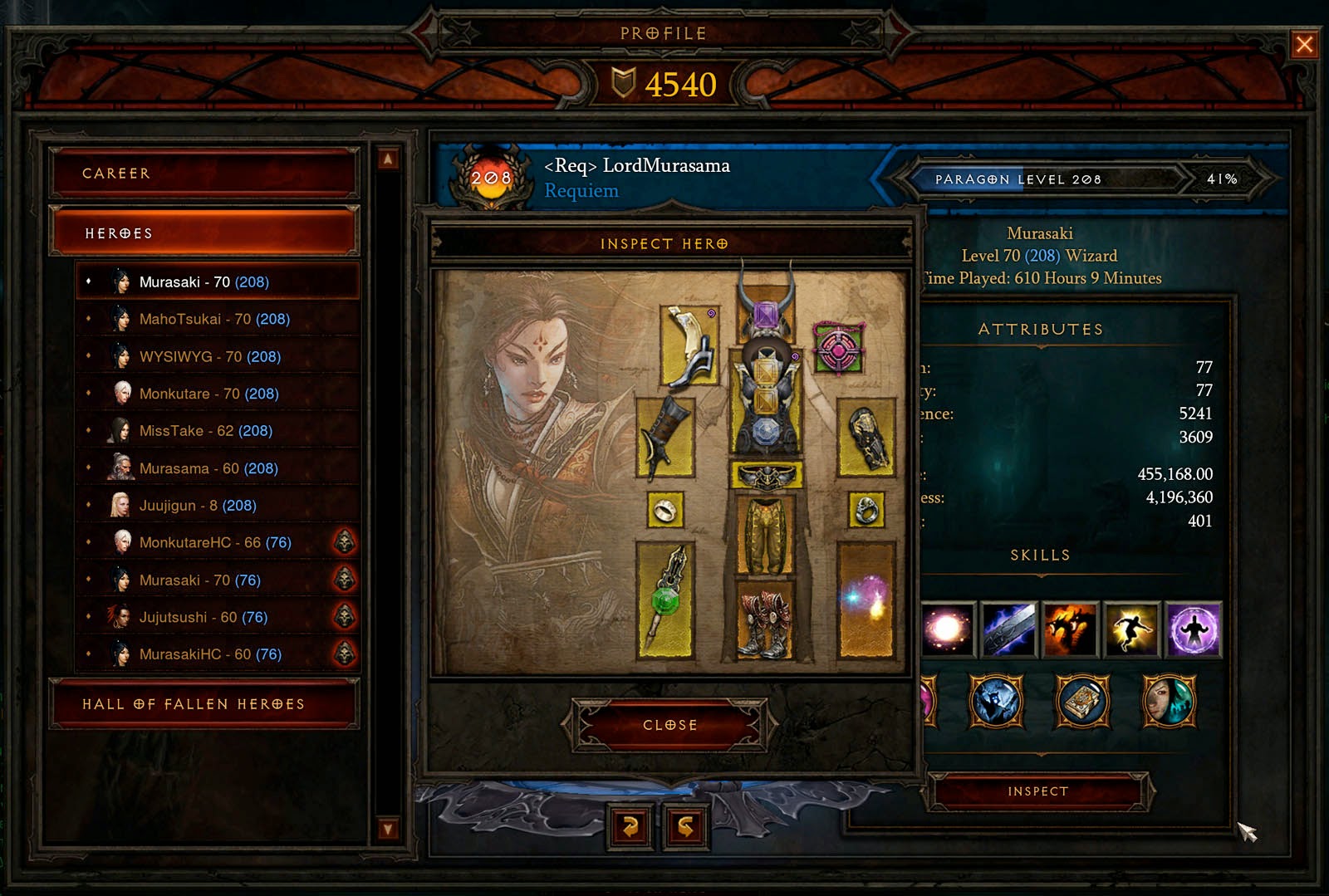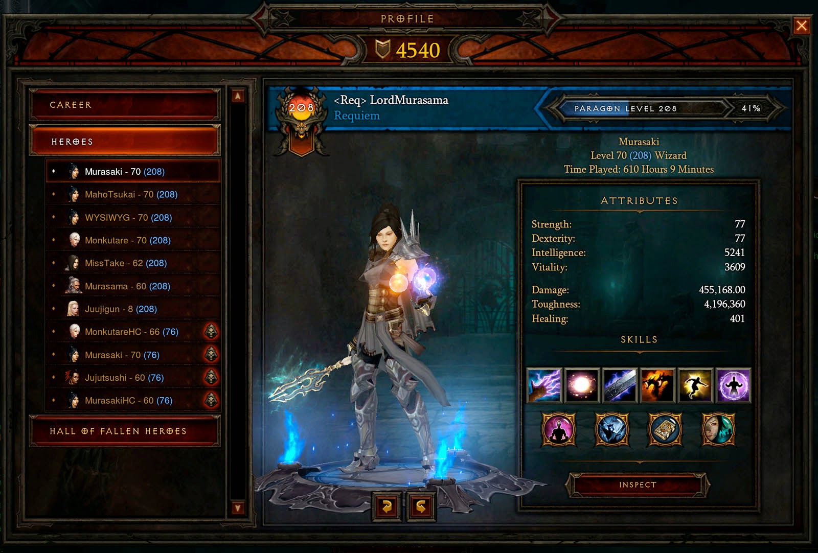 But this is why legacy 1.0 items were not made to be enchantable. The stuff it still workable even at Torment difficulty. They shouldn’t even scale in this manner considering the amount of main stat inflation with loot 2.0 items. It’s a design failure (even though the excuse they gave was balancing out the power curve with itemization). Look at the difference in Intelligence for example. The toughness of both characters is nearly identical. Gear based healing is way in favor of the loot 2.0 geared character ( I use my Paragon points to give 5k life regen for Murasaki – but I definitely need more from gear).
