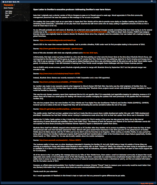 I posted this open letter last week in order to get Trion Worlds to address this titles near term future in light of the recent restructuring changes that have occurred at Bluehole. Prior attempts by others to get an actual response by the pertinent people in charge have been futile because things need to phrased a certain way. Even though I will always have a soft and nostalgic spot for this game, I have also moved on where I no longer invest much time in it. I was asked by others if I could make some kind of statement on the forum since the ones who do play don’t want to see the game die.