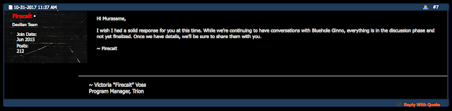 UPDATE: shortly after Firecait made this reply, she was no longer employed with Trion (she was employed at Roblox starting in early November).