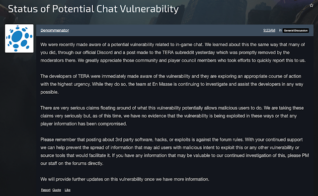 Source: https://forums.enmasse.com/tera/discussion/18877/status-of-potential-chat-vulnerability