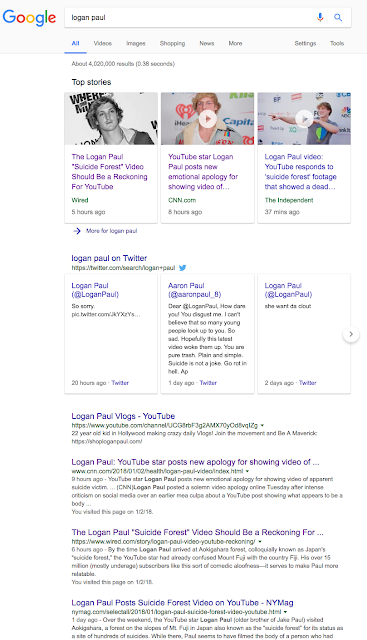 When a particular corner of the Internet hits the mainstream media, you know it has to be something and there’s no shortage of articles from the some of the biggest media enterprises/brands out there covering the YouTube star. I simply typed in just “Logan Paul” into Google.