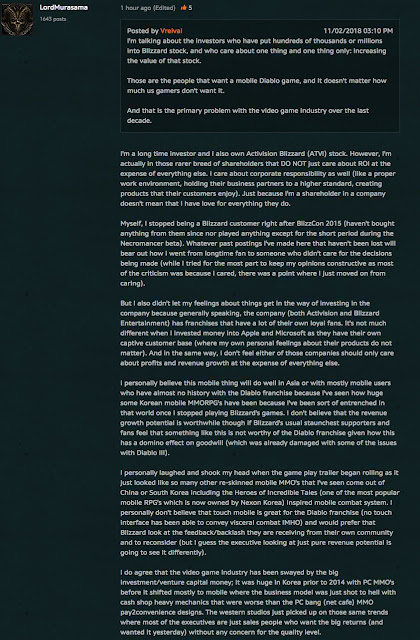 I made a short posting on the official forums in a thread where someone mentioned that this is exactly what “all” Activision Blizzard investors care about. And I had to set the record straight that even though I am an investor in ATVI myself, I’m also not one who believes that a company should only care about revenue growth/profits at the expense of everything else. The day that executives only care about those numbers is the day they mortgage the future longterm viability of their own company (it just takes time for things to manifest itself).