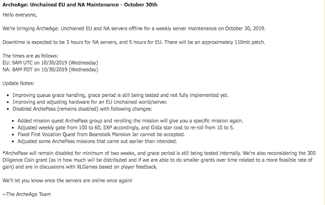 Sourcehttp://forums.archeagegame.com/showthread.php?356529-ArcheAge-Unchained-EU-and-NA-Maintenance-October-30th