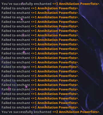 As for this patch, I finally finished the story line at the end of last week while I was in queue for ArcheAge Unchained (I had sort of stopped playing the update for a few days once I hit Verakk Fortress).  So it’s nice to have the meat of the update finally available (the reputation NPC’s, the flying buff and ability to get to the outlying places).  But I am not going to login daily to grind through all of those Exodor dailies.  RNG failure with enchanting the new gear is not my idea of a fun and satisfying reward loop.  As far as the limited amount of time they (EME) put out a blatant cash grab loot box of the new enchanting mats, they need to congratulation themselves for getting a few whales to throw down several tens of thousands of dollars on them in order to achieve results like the following.