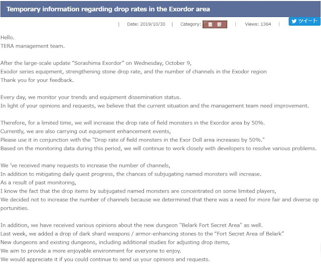 Pmang (Japan) is temporarily increasing the drop rate from Exodor mobs by 50% and also running an enchanting event (to boost the success rate – percentage over base not specified).  Number of channels were also increased (the problem is the design of some maps were it’s way too easy for other players running by, to pull mobs into the ones you are doing).  The publisher will be monitoring and working with Bluehole/Krafton to resolve issues (yeah, right).  Bad machine translation below.