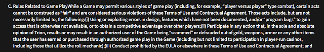 I still stand by my assertion that because of this and how the bugs in that system ended up being abused and ultimately deemed as non-exploits even though it contradicts the terms of use (specifically part 11, code of conduct under section C which I’ve grabbed below), that Gamigo really needs to bite the bullet and offer players the opportunity to request a refund (EU players have better recourse since the game as released is now feature incomplete from what was advertised).