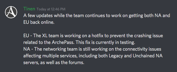 And while they did finally manage to get it online, the servers ran into stability issues which required bringing them offline again.  The culprit ended up being the ArchePass system which they had to end up disabling on EU in order to bring the servers back online again.  In the meantime, NA’s scheduled maintenance was postponed.