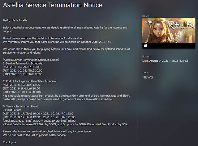 I noted my skepticism about the longevity of the game back in December 2019 when NEXON announced they would be ending the Korean service.  It didn’t help when they opened a free to play version called Astellia Royal (that from reading the Steam discussion forum, turned out to be a “hot mess”).  The game did last longer than I expected even though it seemed it had been running mostly on auto-pilot for most of 2020.