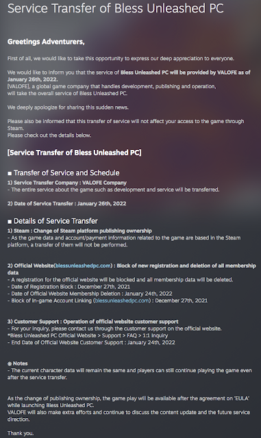 VALOFE has been a destination for many nearly dead MMO’s (MU Legend and Rider’s of Icarus are some examples), where they decided there is enough of a player population to continue making some money off of. In the case of the Bless IP though, it was also in Neowiz’ best interests that their latest attempt, not be completely shuttered (the PC version was launched in August 2021 so yes, this was fairly rapid descent). The game will still launch from Steam (it’s mainly just a transfer of the publishing company and customer support).