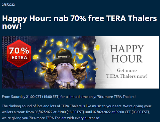 This is the second time Gameforge is running this 70% extra in less than two months time for TERA Thalers (virtual currency to purchase items from the in-game cash shop); the prior promotion was in December (which I noted in my posting about the upcoming closure of the Japanese service). Additionally, they just ran a major discount on various vouchers (character slot, rename scrolls, race change scrolls, etc). EME ran these type of sales on utility items often, but not Gameforge. So when you see this, it sticks out like a red flag.