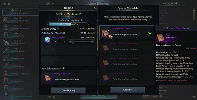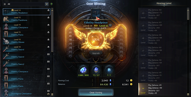 My biggest mistake was not buying the weekly allotment of honing materials from the merchant vessel; this almost turned into a honing shard shortage in Tier 2 when trying to hit 1100 item level (I remembered to buy out this weeks allotment which helped). Leap stones and fusion material however were constantly constrained when I finally hit +14 on all pieces. RNG was on the better side (due to the books that boosted the chance of success) since I had less than 20 total failed honing attempts when finally hitting +15 on all gear slots. But between 14 and 15, those failures burn up a few days to a weeks worth of materials. This is pretty much the story of the item level treadmill that is a gating mechanic by design. This is why I normally just hone (at these higher levels) once a week (March 30th, I was at 1080).