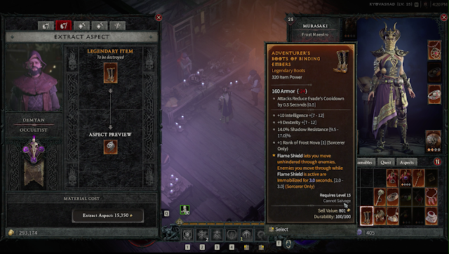 As I mentioned in my early access writeup, the Occultist NPC (unlocked at level 20) with the imprinting system is something that felt great. I was constantly burning through gold since just extracting these lower level legendaries aspects can run 15K per. Rare drops also have value as salvage material or vendoring for gold (to feed the system of item upgrading, crafting gems, and extracting/imprinting aspects). Mind you, this game play loop is based on being capped at level 25 (and very far away from the end game parts of the game where other systems will likely also open up).