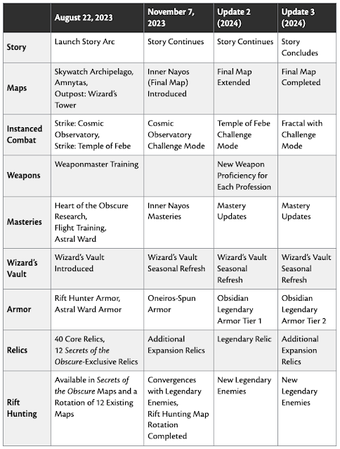 The next story update of the Secrets of the Obscure (SOTO) expansion (entitled Through the Veil) is slated to be released on November 7th along with the last new map (Inner Nayos) for the region. “Through the Veil” will be comprised of 3 new story chapters. ArenaNet provided the following chart of their plans for rolling out the complete SOTO expansion (to be completed in 2024).